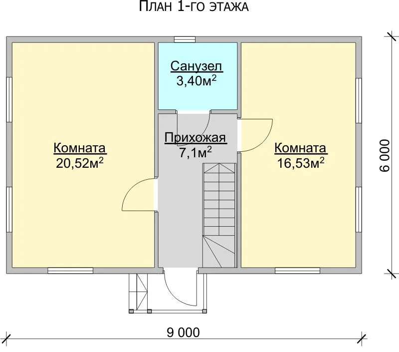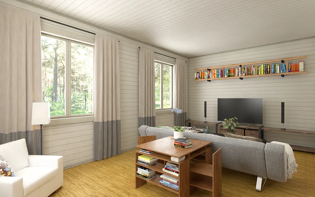 Главное преимущество этого коттеджа — функциональность. При относительно небольших габаритах в нем есть все, что нужно для комфортного загородного отдыха. Кроме гостиной и просторной кухни-столовой, объединенных студийной планировкой, на первом этаже имеется отдельная комната, которая может служить спальней для старших членов семьи.