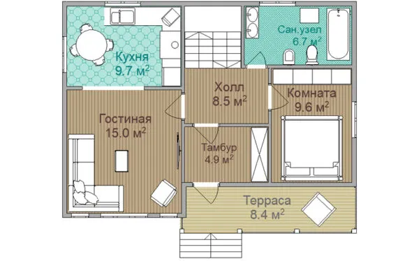 Главное преимущество этого коттеджа — функциональность. При относительно небольших габаритах в нем есть все, что нужно для комфортного загородного отдыха. Кроме гостиной и просторной кухни-столовой, объединенных студийной планировкой, на первом этаже имеется отдельная комната, которая может служить спальней для старших членов семьи.