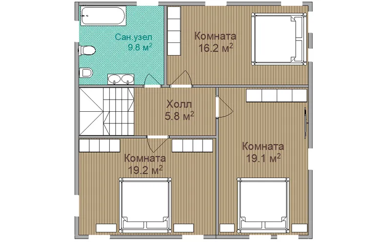 Коттедж «Аврора» — идеальный загородный дом для большой семьи. Нестандартное оформление фасада — «утопленное» крыльцо, просторный балкон над ним и сочетание нескольких групп окон разного размера, придают дому архитектурную выразительность и оригинальность. А современная, чрезвычайно рациональная и функциональная планировка делает этот дом очень удобным для жизни.