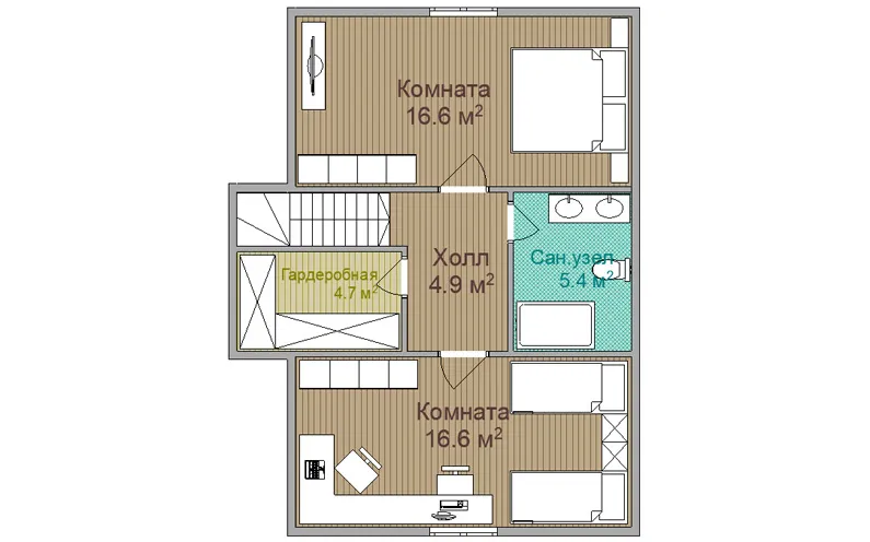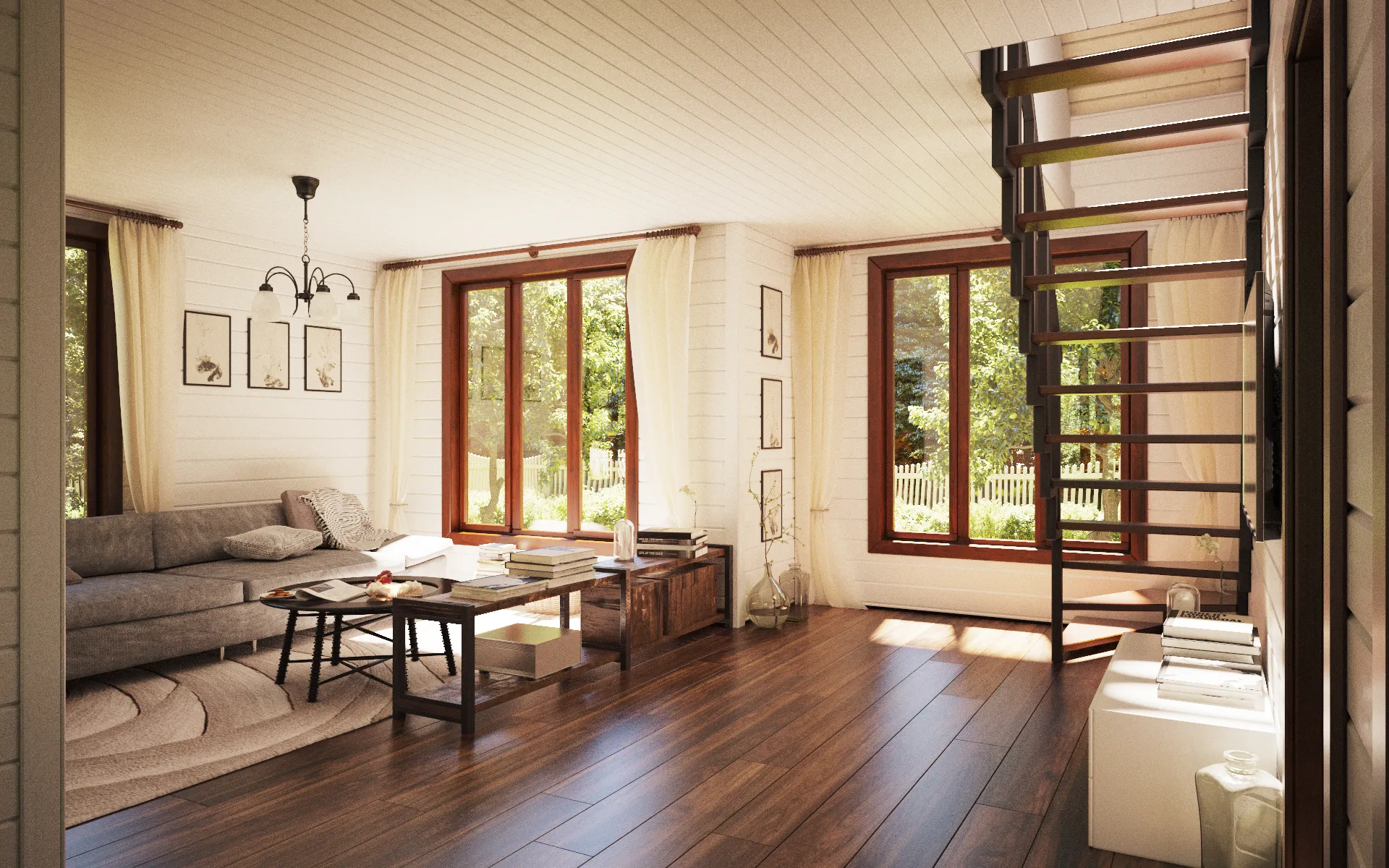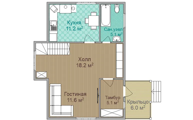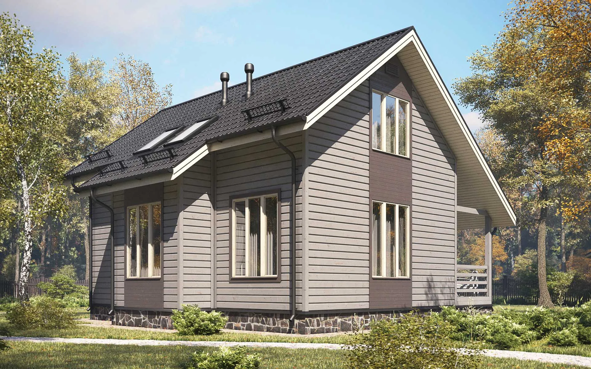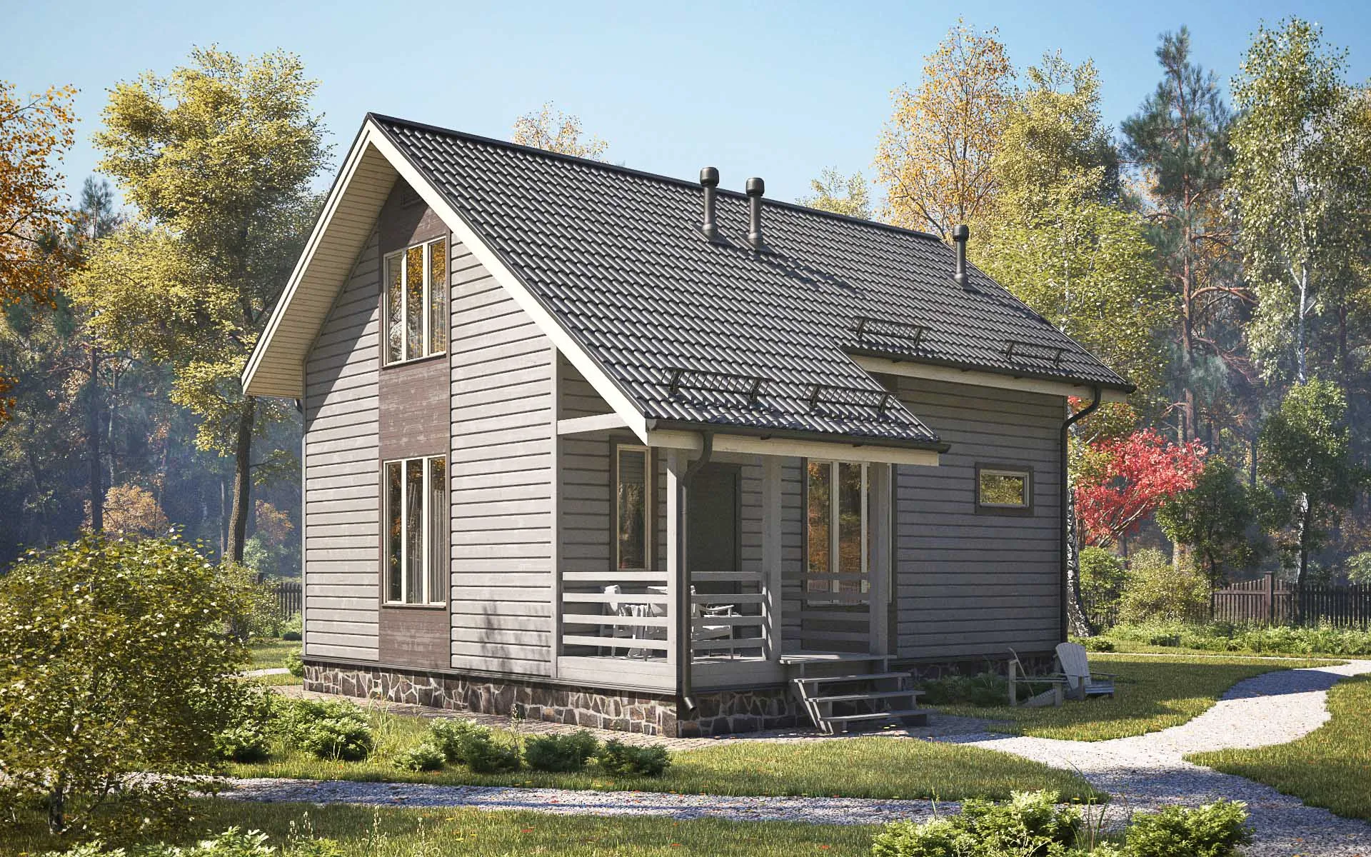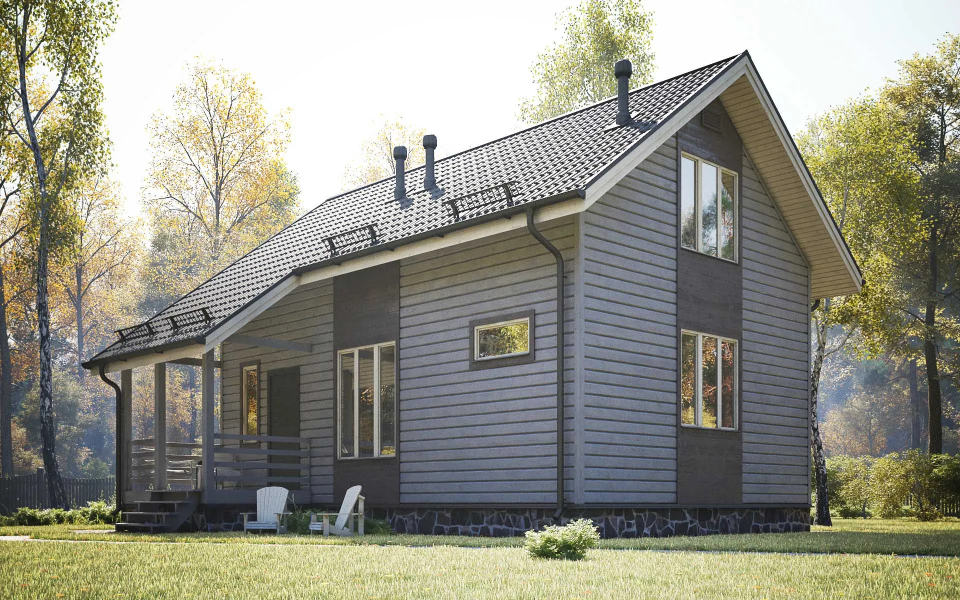 Главное преимущество этого коттеджа — функциональность. При относительно небольших габаритах в нем есть все, что нужно для комфортного загородного отдыха. Кроме гостиной и просторной кухни-столовой, объединенных студийной планировкой, на первом этаже имеется отдельная комната, которая может служить спальней для старших членов семьи.